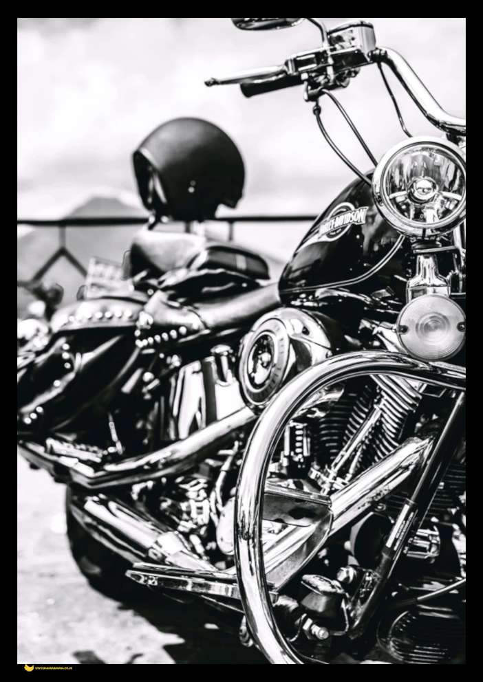 Harley Davidson in monochrome perfect chrome an American classic. Looks great on a bedroom wall office or shop. Classic Americana